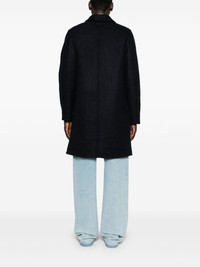 single-breasted coat Highlights - Midnight blue - Boiled wool blend - Front button fastening - Spread collar - Long sleeves - Two button-fastening pockets - Side slits - Straight hem - Knee-length Imported Composition Wool 94%, Polyamide 5%, Cotton 1% SIZE & FIT Model measurements Height 6 ft 2 in(1.87 m) Bust/Chest 36.41 in(92.5 cm) Hips 37 in(94 cm) Waist 29.52 in(75 cm) FittingInformation Designed to be unstructured, offering a loose fit throughout The vented hem offers movement at the rear Made from a midweight non-stretch fabric