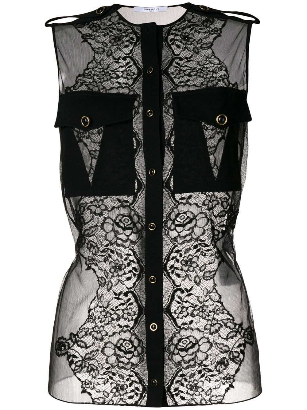 sleeveless lace blouse The French fashion house is famed for its luxurious and subversive sense of sensuality. Crafted in Italy from pure silk and wool, this sheer, sleeveless, mid-length design features a round neck, epaulettes on the shoulders, a front button fastening and a straight hem. Made in Italy Composition Silk 100%, Wool 100%, Viscose 70%, Polyamide 30% SIZE & FIT Model measurements Height 5 ft 10 in(1.77 m) Bust/Chest 32.28 in(82 cm) Hips 35.82 in(91 cm) Waist 24.8 in(63 cm) Washing instructions Dry Clean Only