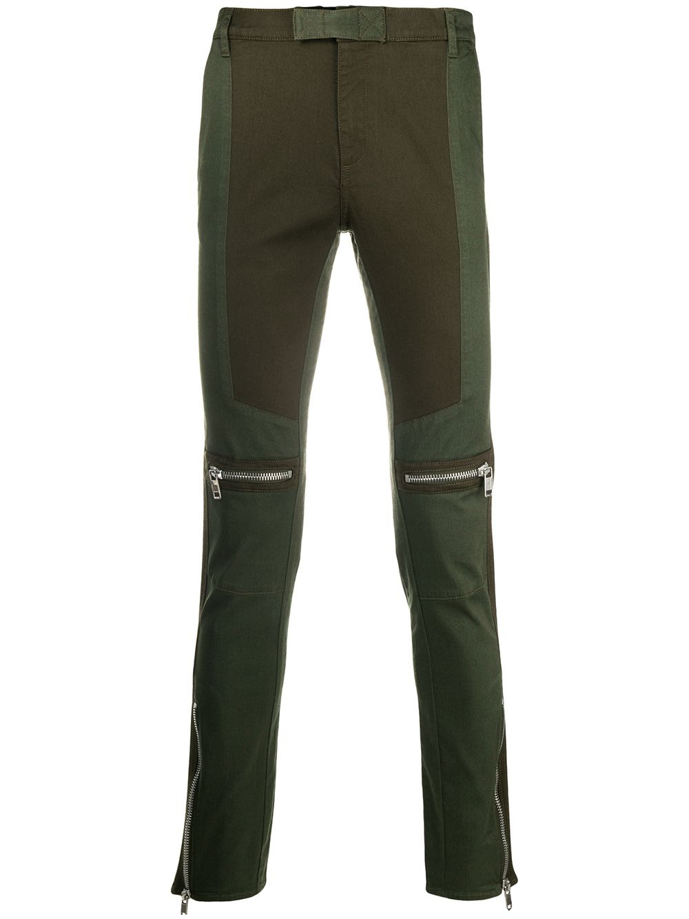 slim-fit biker trousers Givenchy's urban style and dark romanticism provides tough-luxe detailing and an unconventional elegance. These Autumn/Winter 2018 dark khaki cotton slim-fit biker trousers from Givenchy feature a waistband with belt loops, a hook and zip fly, zipped pockets and zipped ankles. Imported Composition Lining: Polyester 65%, Cotton 35% Outer: Cotton 98%, Spandex/Elastane 2% SIZE & FIT Model measurements Height 6 ft 1 in(1.85 m) Bust/Chest 37.79 in(96 cm) Hips 37.4 in(95 cm) Waist 30.7 in(78 cm) Washing instructions Machine Wash