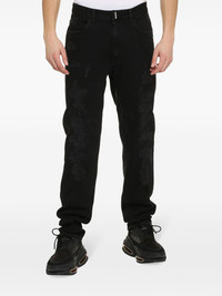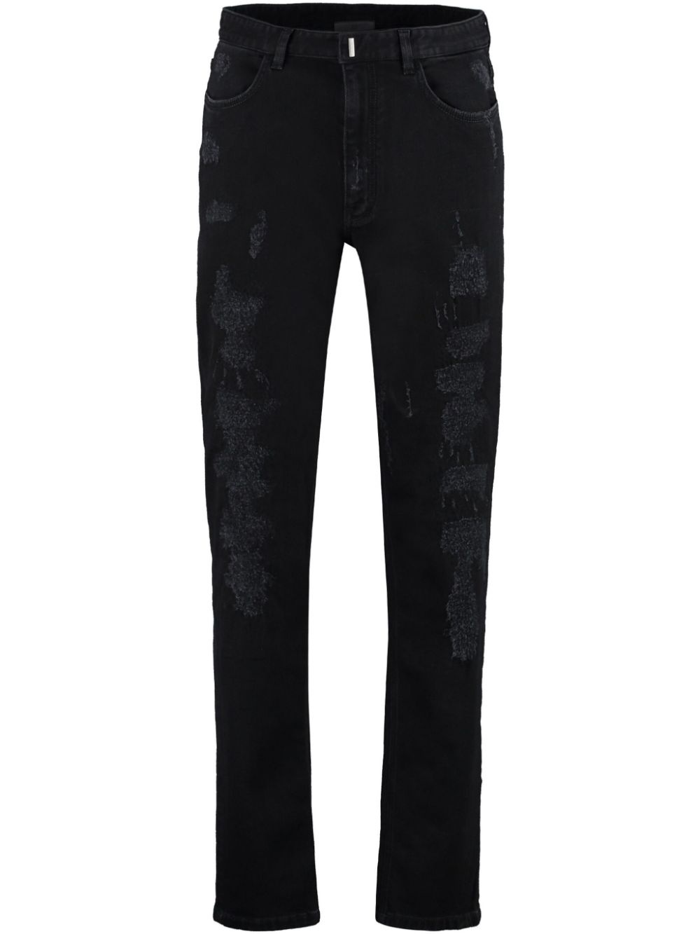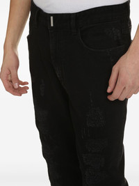 slim-fit destroyed jeans Givenchy's penchant for dark tones and contemporary streetwear is evident in these jeans. Crafted from black denim, the destroyed finish and slim cut add a modern touch to the design. Made in Italy Composition Outer: Cotton 98%, Spandex/Elastane 2% Lining: Polyester 65%, Cotton 35% SIZE & FIT FittingInformation This piece fits true to size. We recommend you get your regular size Regular fit Made with a mid-weight stretch fabric Washing instructions Machine Wash