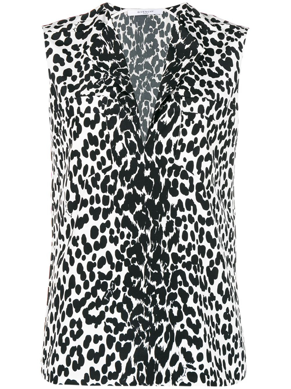 split neck blouse Under the Creative Direction of Claire Waight Keller, Givenchy matures its beautifully brooding aesthetic, configuring the core pillars of the brand to tender a tale of modern romance. Bold and sophisticated, this effortless cool animal print blouse has been crafted in Italy from pure silk and cut in a flattering loose silhouette. Perfect for day to evening wear, the black and white piece is flawlessly constructed with a split neck, a sleeveless design, two chest pockets and a straight hem. Made in Italy Composition Silk 100% SIZE & FIT Model measurements Height 5 ft 10 in(1.77 m) Bust/Chest 31.49 in(80 cm) Hips 35.43 in(90 cm) Waist 23.22 in(59 cm) Washing instructions Dry Clean Only