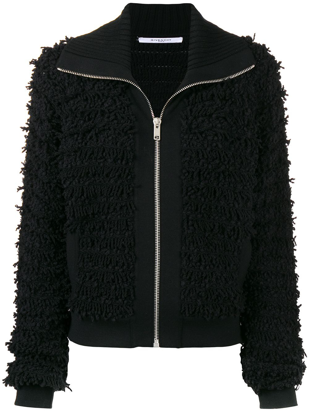 textured jacket Break away from an all-black palette with this textured jacket from Givenchy. Riffing off the sportswear style with its short bomber silhouette, the design features a voluminous and tactile woolly fringe, finished with a ribbed collar, long sleeves, a ribbed hem and cuffs, a front zip fastening and side slit pockets. Made in Italy Composition Wool 96%, Polyamide 4% SIZE & FIT Model measurements Height 5 ft 11 in(1.8 m) Bust/Chest 31.49 in(80 cm) Hips 35.82 in(91 cm) Waist 24.8 in(63 cm) Washing instructions Dry Clean Only