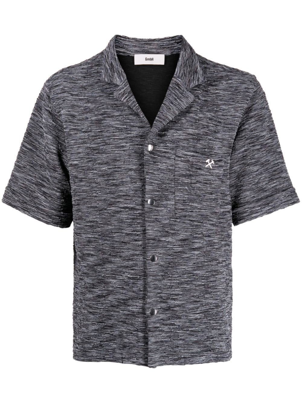 logo-plaque melange-effect shirt Highlights - Grey - Recycled polyester blend - Melange effect - Silver-tone logo plaque - Front button fastening - Notched collar - Short sleeves - Straight hem - Chest patch pocket Imported Composition Recycled Polyester 65%, Polyester 29%, Polyamide 5%, Elastane 1% SIZE & FIT Model measurements Height 6 ft 2 in(1.88 m) Bust/Chest 31.88 in(81 cm) Hips 35.82 in(91 cm) Waist 27.55 in(70 cm) FittingInformation Designed to be unstructured, offering a loose fit throughout Made from a midweight stretch fabric, this piece offers elasticity and flexibility when worn This piece fits true to size – take your usual size Washing instructions Machine Wash