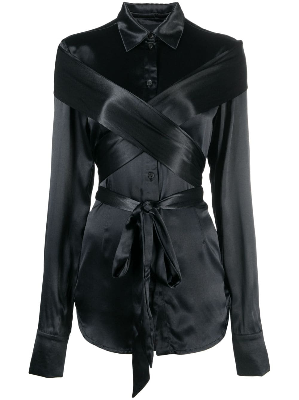 wraparound-strap satin shirt Highlights - Black - Satin finish - Wraparound style - Strap detailing - Classic collar - Front button fastening - Long sleeves - Buttoned cuffs - Tied waist - Curved hem Imported Composition Viscose 100% SIZE & FIT Model measurements Height 5 ft 10 in(1.78 m) Bust/Chest 33.46 in(85 cm) Hips 36.22 in(92 cm) Waist 23.22 in(59 cm) FittingInformation Designed for a slim fit that sits just away from the body offering a close yet comfortable fit The tie fastening gives an adaptable and personalised fit Made from a midweight non-stretch fabric This piece fits true to size – take your usual size Washing instructions Dry Clean Only