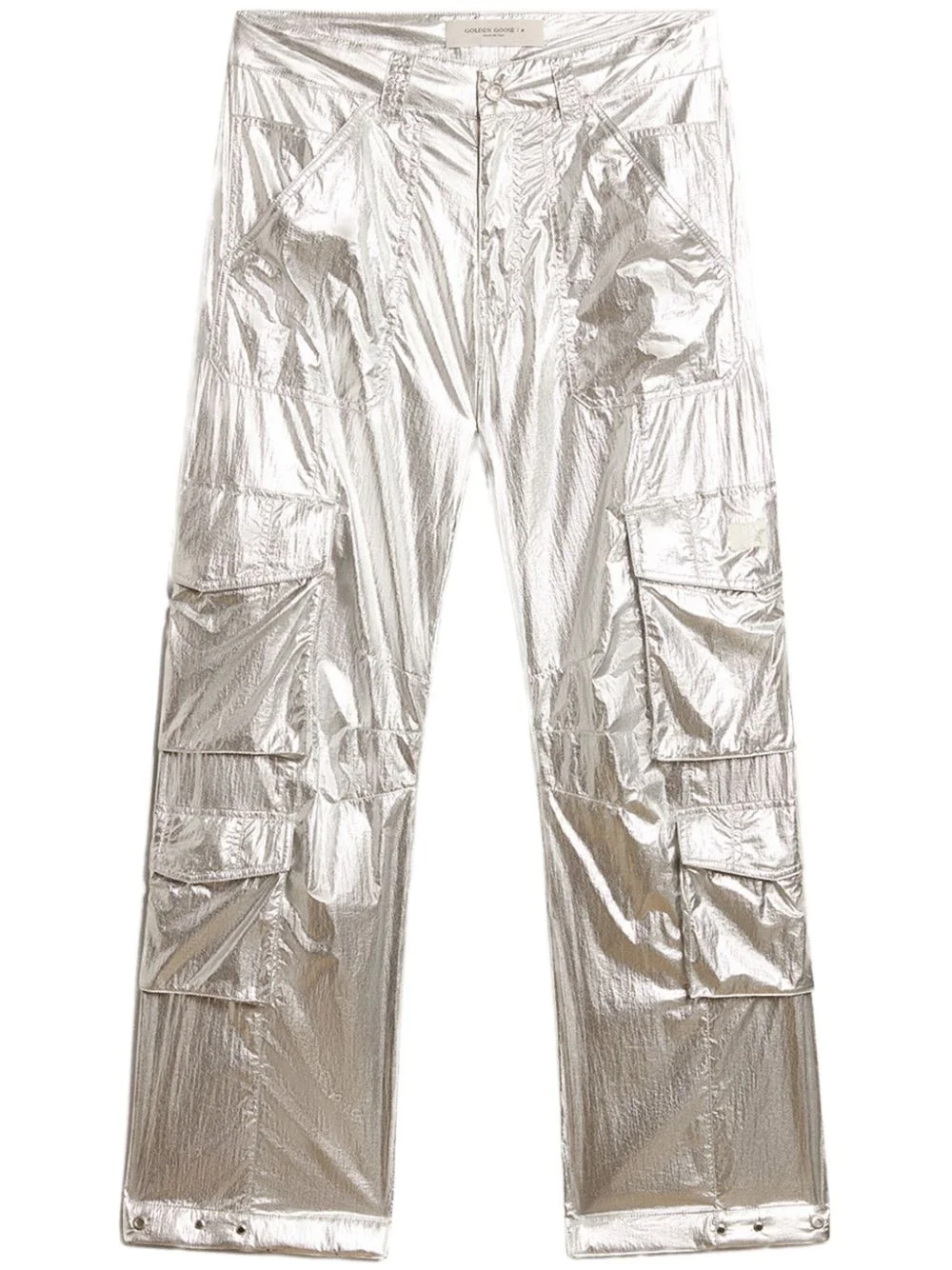 cargo pants in silver technical fabric Highlights - Silver - Technical fabric - Ten pockets - Press-stud fastening - Marathon logo on the front - The model is 177 cm tall and is wearing a size 40. Made in Italy Composition Polyamide 100% SIZE & FIT Measurement HIPS 40.94 in(104 cm) WAIST 29.13 in(74 cm) Washing instructions Read Manufacturer Guidelines