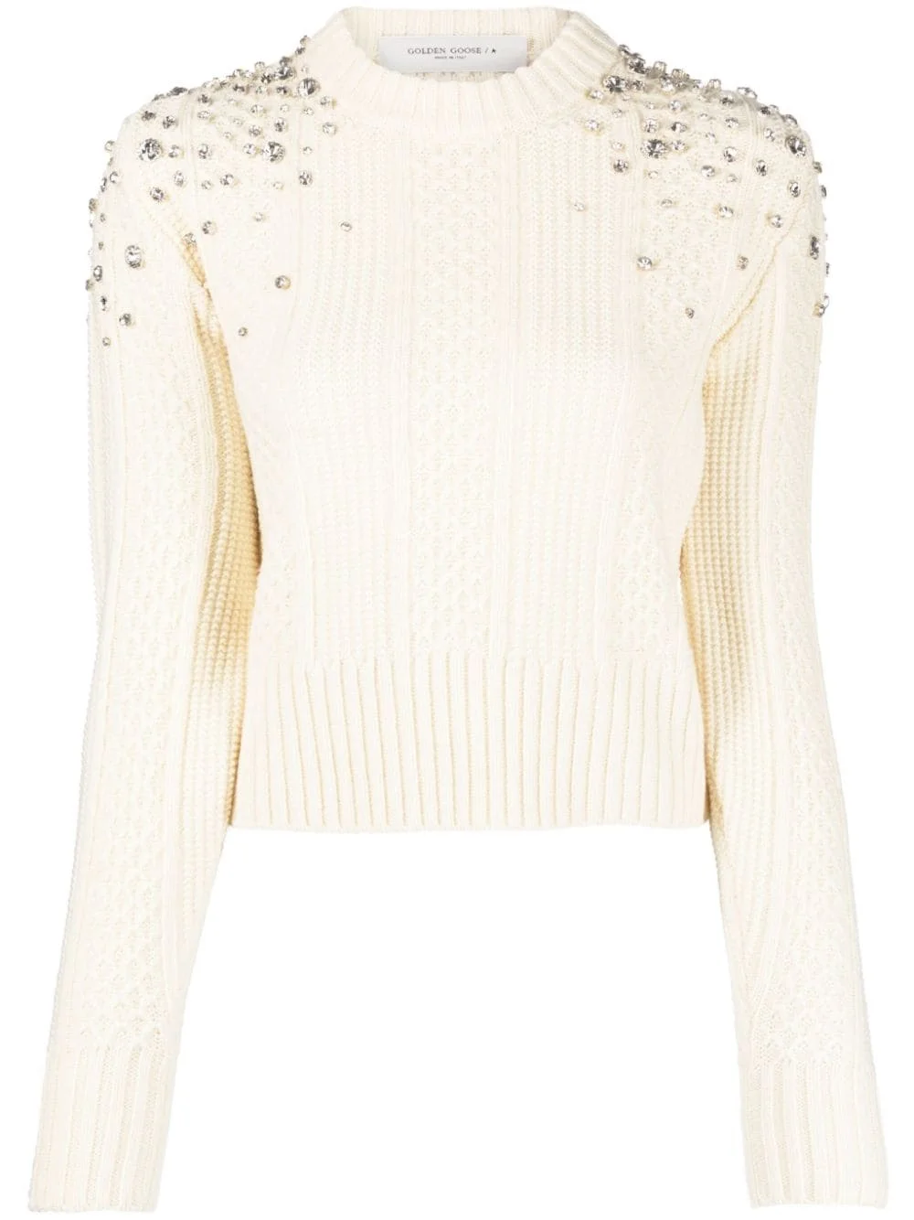 crystal-embellished virgin wool jumper Highlights - Cream white - Virgin wool - Knitted construction - Crystal embellishment - Round neck - Long sleeves - Ribbed cuffs and hem Made in Italy Composition Virgin Wool 100% Washing instructions Hand Wash