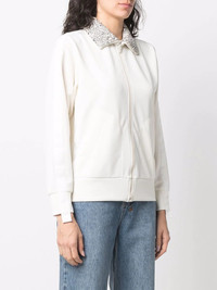 crystal-embellished zipped sweatshirt cream crystal embellishment front zip fastening two side slit pockets long sleeves straight hem Made in Italy Composition Polyester 100% SIZE & FIT Model measurements Height 5 ft 10 in(1.79 m) Bust/Chest 33.07 in(84 cm) Hips 35.82 in(91 cm) Waist 24.01 in(61 cm) FittingInformation This piece fits true to size. We recommend you get your regular size Cut for a loose fit Made with a mid-weight fabric