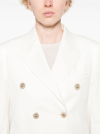 double-breasted blazer Highlights - White - Notched lapels - Shoulder pads - Long sleeves with buttoned cuffs - Chest welt pocket - Two side flap pockets - Rear star stud detailing - English rear vents - Full lining - Double-breasted button fastening Made in Italy Composition Outer: Polyester 55%, Virgin Wool 45% Lining: Viscose 55% SIZE & FIT Model measurements Height 5 ft 9 in(1.75 m) Bust/Chest 34.64 in(88 cm) Hips 36.61 in(93 cm) Waist 26.37 in(67 cm) FittingInformation Designed for a slim fit that sits just away from the body offering a close yet comfortable fit The internal shoulder pads offer a structured shape Made from a heavyweight non-stretch fabric This piece fits true to size – take your usual size