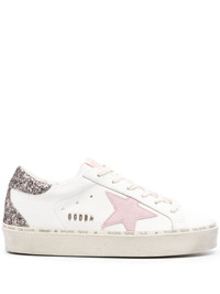 Hi Star glittered sneakers Golden Goose's Hi Star sneakers put an elevated spin on the brand’s Super Star design in a literal sense – they’re grounded on distressed flatform soles traced with scribbled lettering. The white leather uppers are adorned with a glittered heel panel and pink suede start patch. Highlights - White - Light pink - Calf leather - Glitter detailing - Signature star patch to the sides - Perforated detailing - Contrasting heel counter - Logo patch at the tongue - Logo at the sole - Tonal stitching - Round toe - Front lace-up fastening - Branded leather insole - Flatform sole - This piece comes complete with a protective dust bag. Made in Italy Composition Leather 100% SIZE & FIT Measurement HEEL 1.18 in(3 cm)