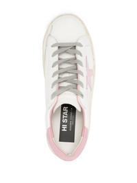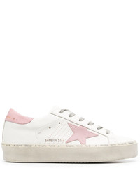 Hi Star platform sneakers Inspired by the Super-Star model, these Golden Goose Hi Star sneakers are characterised by their platform rubber sole, trimmed with logo-printed double foxing. The low-top design is finished with a signature star patch to the sides and intentional distressing for a love-worn look. Highlights - White/light pink - Buffalo leather - Signature star patch to the sides - Distressed finish - Contrasting branded heel counter - Round toe - Front lace-up fastening - Branded insole - Platform sole - Flat rubber sole Made in Italy Composition Lining: Fabric 100% Sole: Rubber 100% Outer: Calf Leather 100% SIZE & FIT Measurement HEEL 1.96 in(5 cm) Sole height 1.37 in(3.5 cm) Washing instructions Read Manufacturer Guidelines