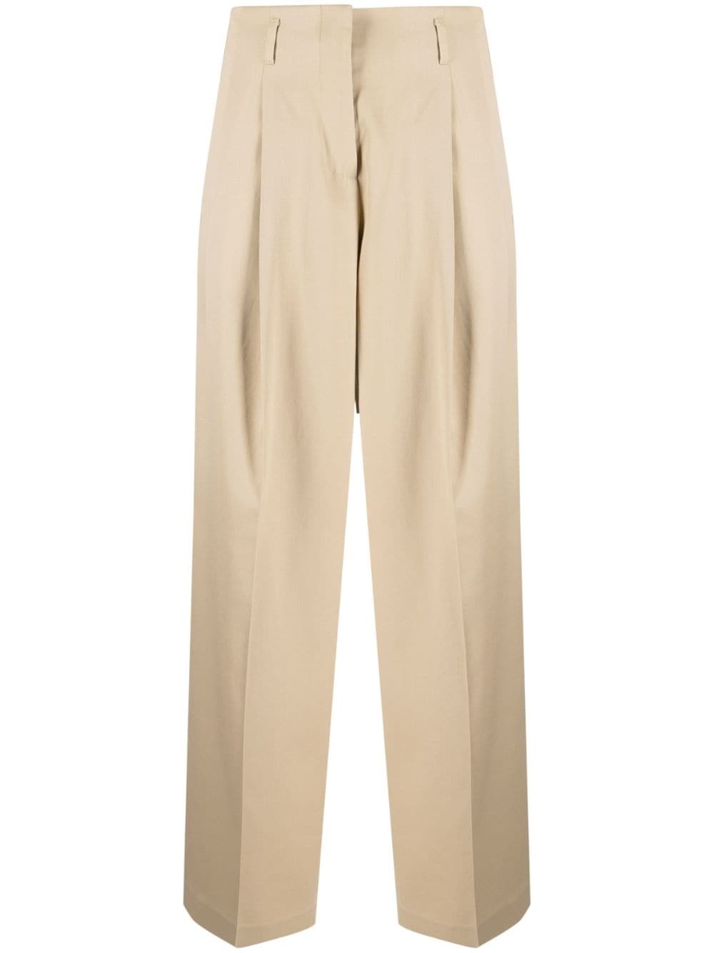 high-waisted wide-leg trousers Highlights - Sand beige - Logo patch to the rear - Star stud detailing - Pressed crease - High waist - Box-pleat detail - Two rear flap pockets - Belt loops - Wide leg Made in Italy Composition Outer: Virgin Wool 100% Lining: Viscose 100%, Polyester 65%, Cotton 35% SIZE & FIT Model measurements Height 5 ft 10 in(1.78 m) Bust/Chest 31.49 in(80 cm) Hips 36.22 in(92 cm) Waist 25.59 in(65 cm) FittingInformation Designed for a straight-leg fit, these trousers allow for a close fit at the waist and an unrestricted, comfortable fit over the leg The belt offers adjustability for fitted preferences Made from a midweight non-stretch fabric This piece fits true to size – take your usual size