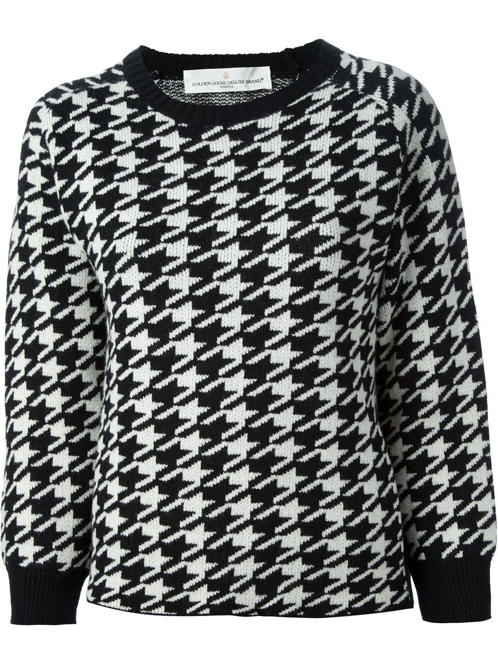 houndstooth print sweater Black and white houndstooth print sweater from Golden Goose featuring a round neckline, long sleeves with contrasting black ribbed cuffs and a black rear hem. Made in Italy Composition Wool 100% SIZE & FIT Model measurements Height 5 ft 9 in(1.75 m) Bust/Chest 31.88 in(81 cm) Hips 33.85 in(86 cm) Waist 25.19 in(64 cm) Washing instructions Dry Clean Only