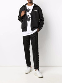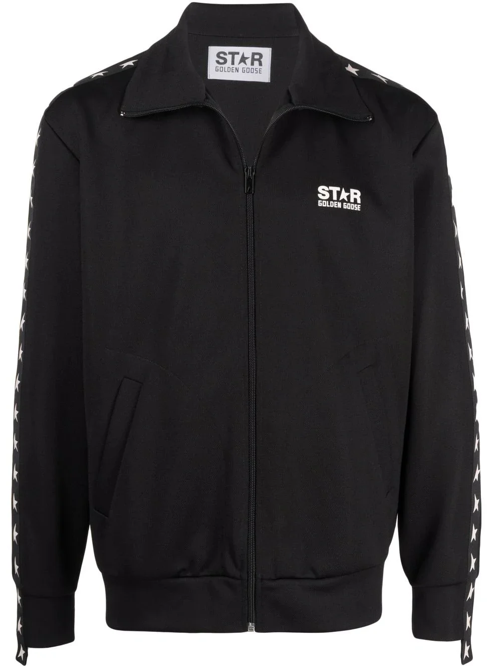logo-print zip-fastening jacket Created at the turn of the millennium in 2000, Golden Goose balances modern style with a vintage feeling. This is shown through the use of contemporary branding; with a logo print at the chest and star-print stripe detailing at the sides, on a classic casual jacket silhouette. Highlights Made in Italy Composition Polyester 100% SIZE & FIT Model measurements Height 6 ft 2 in(1.89 m) Bust/Chest 35.43 in(90 cm) Hips 36.61 in(93 cm) Waist 28.74 in(73 cm) FittingInformation This piece fits true to size. We recommend you get your regular size Cut for a loose fit Made with a mid-weight non-stretch fabric