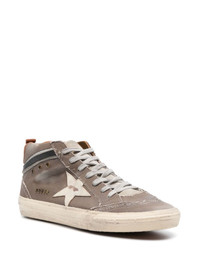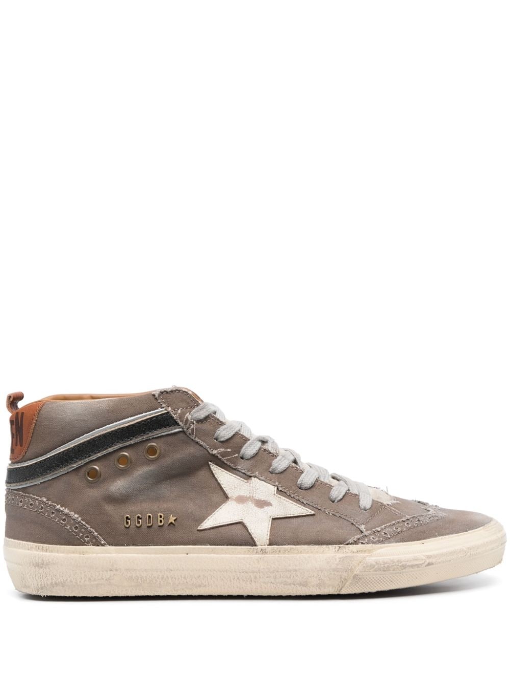 Mid Star distressed-effect sneakers Italian label Golden Goose is a prominent player in footwear, most notably known for its lineup of sneakers with a signature distressed effect. Originally designed to provide a love-worn look to each silhouette, the distressed and scuffed marks can be found across these Mid-Star high-tops as a final stamp of approval. Highlights - Taupe brown - Cotton - Panelled design - Distressed effect - Signature star patch to the sides - Logo plaque - Ankle-length - Front lace-up fastening - Round toe - Flat rubber sole Made in Italy Composition Lining: Cotton 100% Outer: Cotton 100% Sole: Rubber 100% SIZE & FIT Measurement HEEL 1.18 in(3 cm) Sole height 0.98 in(2.5 cm)