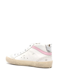 Mid Star high-top sneakers Inspired by the eighties skate scene, this pair of Mid Star sneakers from Golden Goose feature a metallic iteration of the brand's signature star patch, complemented by signature silver-tone logo lettering to complete the design. Highlights - White/pink/silver-tone - Calf leather - Panelled design - Round toe - Signature ghillies brogue trim - Front lace-up fastening - Logo patch to the front - Pull-tab at the heel - Contrasting branded heel counter - Logo print to the side - Signature star patch to the sides - Flatform sole - Distressed effect - Branded leather insole - French terry lining Made in Italy Composition Leather 100% SIZE & FIT Measurement HEEL 0.98 in(2.5 cm) Sole height 0.59 in(1.5 cm)
