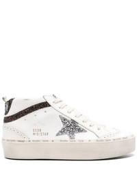 Mid Star high-top sneakers Golden Goose's Mid Star sneakers are reimagined each season: this pair are adorned with glittered detailing. Staying true to the brand’s love-worn aesthetic, they’re complete with signature distressing and a classic star motif at the sidewall. Highlights - White/silver-tone/brown - Calf leather - Smooth grain - Glitter detailing - Signature ghillies brogue trim - Round toe - Front lace-up fastening - Logo patch at the tongue - Pull-tab at the heel - Contrasting branded heel counter - Signature star patch to the sides - Flatform sole - Slogan print to the sole - Branded insole Made in Italy Composition Leather 100% SIZE & FIT Measurement HEEL 1.18 in(3 cm) Sole height 0.78 in(2 cm)