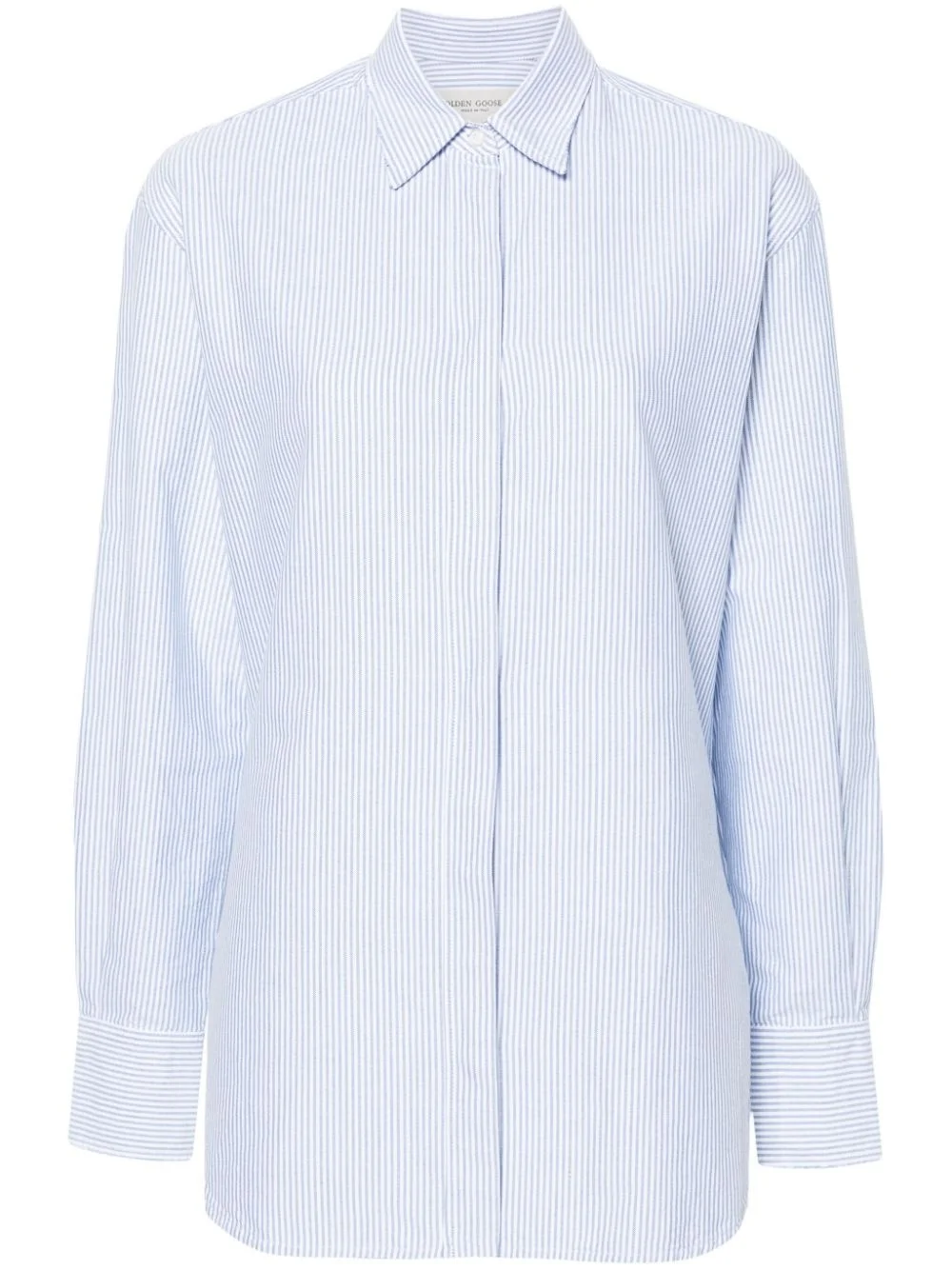 Oxford striped shirt A timeless wardrobe staple with a twist. This white and blue Oxford shirt from Golden Goose is made from crisp cotton with vertical stripes and detailed with a logo patch on the cuff. Highlights - White/blue - Cotton - Vertical stripe print - Logo patch at the sleeve - Classic collar - Drop shoulder - Front button fastening - Long sleeves - Buttoned cuffs - Curved hem Made in Italy Composition Cotton 100% SIZE & FIT Measurement LENGTH 29.13 in(74 cm) BUST 41.33 in(105 cm) Shoulder Width 18.42 in(46.8 cm) SLEEVE LENGTH 23.38 in(59.4 cm) WAIST 39.37 in(100 cm) Washing instructions Machine Wash