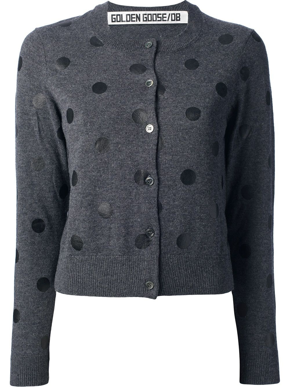 polka dot cardigan Grey cashmere-wool cardigan from Golden Goose featuring a round neck, a front button fastening, ribbed cuffs, a ribbed hem and a polka dot print. Imported Composition Wool 80%, Cashmere 20% SIZE & FIT Model measurements Height 5 ft 9 in(1.75 m) Bust/Chest 33.46 in(85 cm) Hips 36.61 in(93 cm) Waist 25.59 in(65 cm) Washing instructions Dry Clean Only