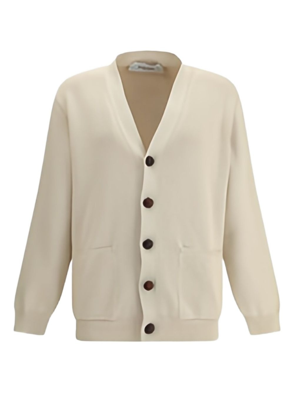 ribbed back-logo cardigan Highlights - Off-white - Ribbed knit - V-neck - Button fastening - Patch logo - Welt pockets Imported Composition Organic Cotton 100% Washing instructions Read Manufacturer Guidelines