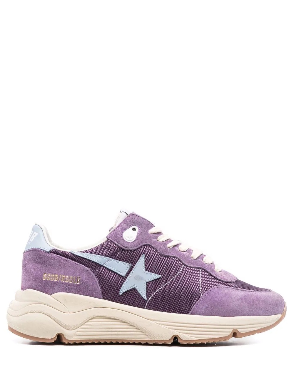 Running Sole low-top sneakers A testimony to Golden Goose's interpretation streetwear elegance, the Running Sole sneakers incorporate a sporty feel and high-quality materials. Displaying a panelled design, the pair features the signature star patch on the side and a chunky rubber sole. Highlights - Mauve purple/sky blue - Calf suede - Panelled design - Signature star patch to the sides - Logo print to the rear - Logo patch at the tongue - Almond toe - Front lace-up fastening - Branded insole - Chunky rubber sole Made in Italy Composition Lining: Calf Leather 100%, Fabric 100% Sole: Rubber 100% Outer: Fabric 100%, Calf Suede 100% SIZE & FIT Measurement HEEL 1.96 in(5 cm) Sole height 0.98 in(2.5 cm)