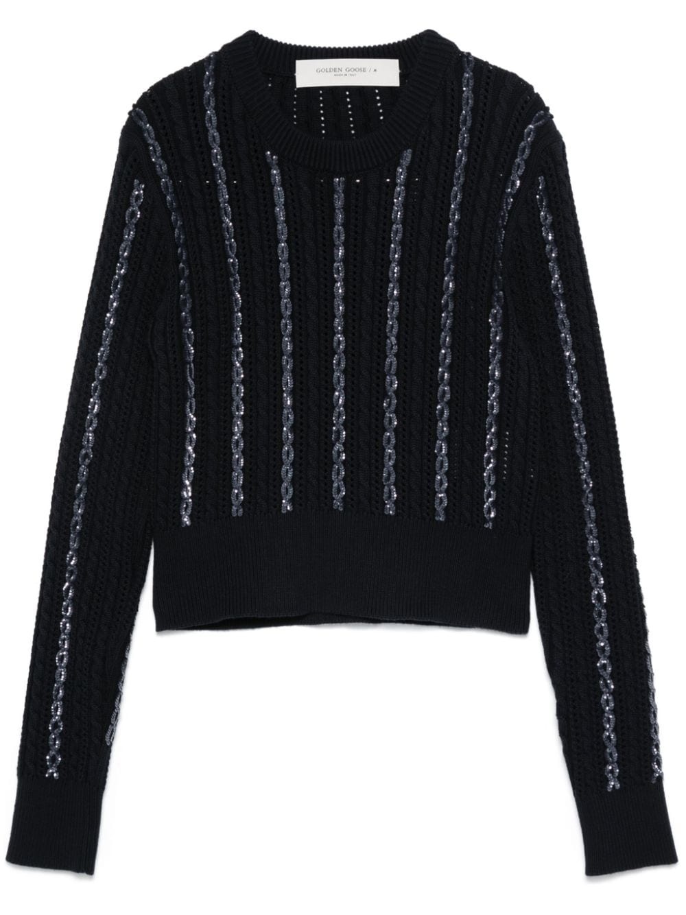 sequin-detailing sweater Highlights - Midnight blue - Organic cotton - Cable knit - 3d-knit construction - Sequin detailing - Crew neck - Long sleeves - Cropped - Straight hem Made in Italy Composition Organic Cotton 100% SIZE & FIT Model measurements Height 5 ft 11 in(1.8 m) Bust/Chest 33.07 in(84 cm) Hips 37.4 in(95 cm) Waist 25.19 in(64 cm) FittingInformation Designed for a slim fit that sits just away from the body offering a close yet comfortable fit The ribbed hem offers a close, comfortable fit Made with a midweight knit, this piece offers some stretch