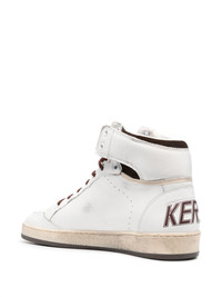 Sky-Star high-top sneakers Inspired by ‘the basketball scene of the ‘80s’, Golden Goose’s Sky-Star sneakers are crafted from distressed leather to a high-top silhouette. The signature suede star patch and handwritten cursive logo add a distinctive touch. Highlights - White/multicolour - Calf leather - Logo print to the side - Signature star patch to the sides - Round toe - Perforated detailing - Front lace-up fastening - Logo patch at the tongue - Rubber sole Made in Italy Composition Outer: Fabric 100%, Calf Leather 100% Lining: Fabric 100%, Calf Leather 100% Sole: Rubber 100% SIZE & FIT Measurement CIRCUMFERENCE 11.02 in(28 cm) HEEL 1.18 in(3 cm) HEIGHT 4.72 in(12 cm) Sole height 0.78 in(2 cm)