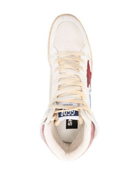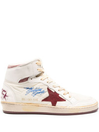 Sky Star high-top sneakers A high-top version of its Ball Star model, Golden Goose’s distressed Sky Star sneaker is imbued with ‘an American college vibe and a feel of the basketball scene of the Eighties’ – the inscription at the side references a player’s signature. This beige and burgundy pair is made from leather and shell with a signature star at the side and cracked ‘sneaker’ lettering at the heels. Highlights - Beige - Burgundy - White - Calf leather - Suede panels - Shell - Panelled design - Distressed effect - Logo print to the side - Signature star patch to the sides - Logo patch at the tongue - Front lace-up fastening - Perforated toebox - Round toe - Branded heel counter - Ankle-length - Branded leather insole - Flat rubber sole - This piece comes complete with a protective dust bag. Made in Italy Composition Outer: Calf Leather 100%, Fabric 100% Lining: Fabric 100%, Calf Leather 100% Sole: Rubber 100% SIZE & FIT Measurement HEEL 1.37 in(3.5 cm) HEIGHT 4.13 in(10.5 cm) Sole height 0.98 in(2.5 cm)