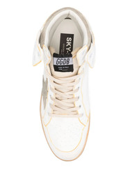 SKY STAR "White / Brown" Crafted in Italy these Sky-Star high-top sneakers from Golden Goose feature the signature star patch on the sides in suede for a delicate touch. Highlights - Sky star gmf00230 f004089 10961 fs Imported Composition Outer: Calf Leather 100%, Fabric 100% Lining: Calf Leather 100%, Fabric 100% Sole: Rubber 100% SIZE & FIT Measurement CIRCUMFERENCE 11.02 in(28 cm) HEEL 4.33 in(11 cm) HEIGHT 1.18 in(3 cm) Sole height 0.78 in(2 cm)