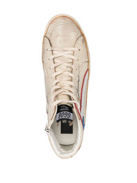 Slide high-top sneakers Golden Goose's Slide sneakers nod to the skateboarding scene of Venice Beach. Crafted from distressed leather, this high-top silhouette features an ecru panelled upper with a padded collar for enhanced comfort and protection, while the brand's signature star patch embellishes the sides. Highlights - Ecru - Leather - Signature star patch to the sides - Distressed finish - Padded panels - Ankle-length - Round toe - Logo patch at the tongue - Front lace-up fastening - Side zip fastening - Flat rubber sole Made in Italy Composition Lining: Bovine Leather (top grain) 100% Outer: Bovine Leather (top grain) 100% Sole: Rubber 100% SIZE & FIT Measurement HEEL 1.18 in(3 cm) HEIGHT 3.93 in(10 cm) Sole height 0.98 in(2.5 cm)