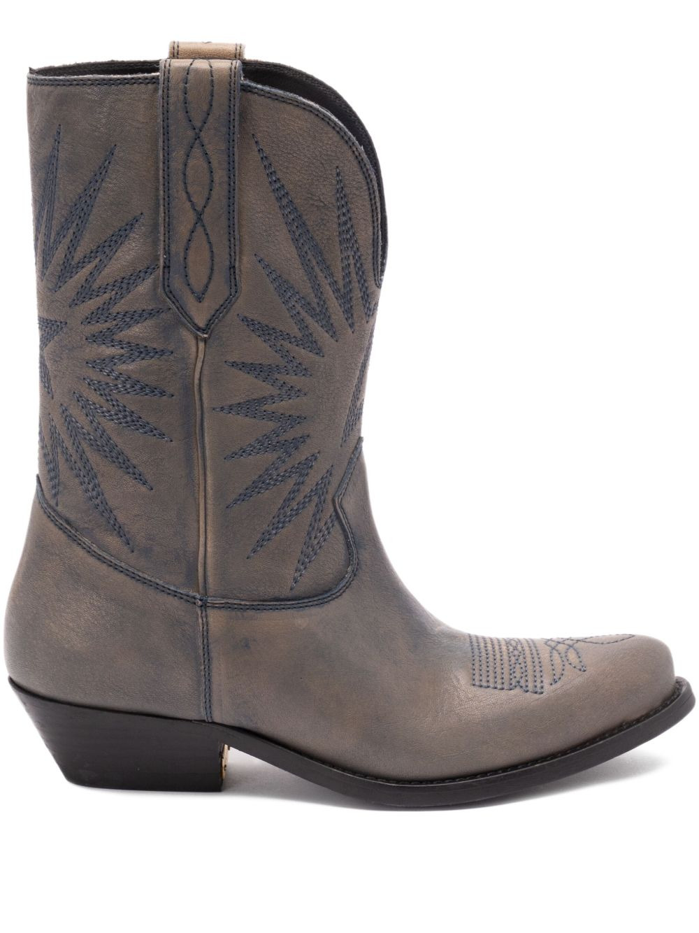 star-embroidered leather boots Highlights - Grey - Leather upper - Star embroidery - Pointed toe - Low heel Made in Italy Composition Lining: Calf Leather 100% Sole: Calf Leather 100% Outer: Bos Taurus 100%