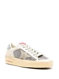 Stardan crystal-embellished leather sneakers Shimmering details and a lived-in feel are a hallmark of Golden Goose's footwear range, and these Stardan sneakers are no exception. Inspired by '90s basketball shoes, they are crafted from smooth leather to a streamlined silhouette that is hand-distressed by skilled artisans in Italy. As a finishing touch, a signature star patch adds an unmistakable touch whilst glitter illuminates the toebox, sides and heel. Highlights - Bone white/medium grey/cream white - Calf leather/buffalo leather - Panelled design - Swarovski crystal embellishment - Signature star patch to the sides - Contrast lettering at the sole - Gold-tone lettering to the side - Logo patch at the tongue - Round toe - Front lace-up fastening - Branded insole - Partial pile lining - Flat rubber sole - This piece comes complete with a protective dust bag. Made in Italy Composition Leather 100% SIZE & FIT Measurement HEEL 1.37 in(3.5 cm) Sole height 0.98 in(2.5 cm)