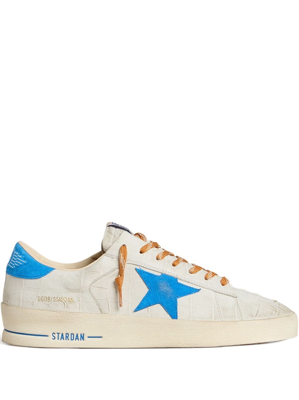 Stardan star-printed crocodile-effect sneakers Highlights - Off-white - Crocodile-effect leather - Blue star patch - Orange lace-up fastening - Rubber sole - Leather heel tab Made in Italy Composition Lining: Cotton 42%, Calf Leather 25%, Polyurethane 22%, Viscose 6%, Polyester 5% Outer: Calf Leather 100% Sole: Rubber 100%
