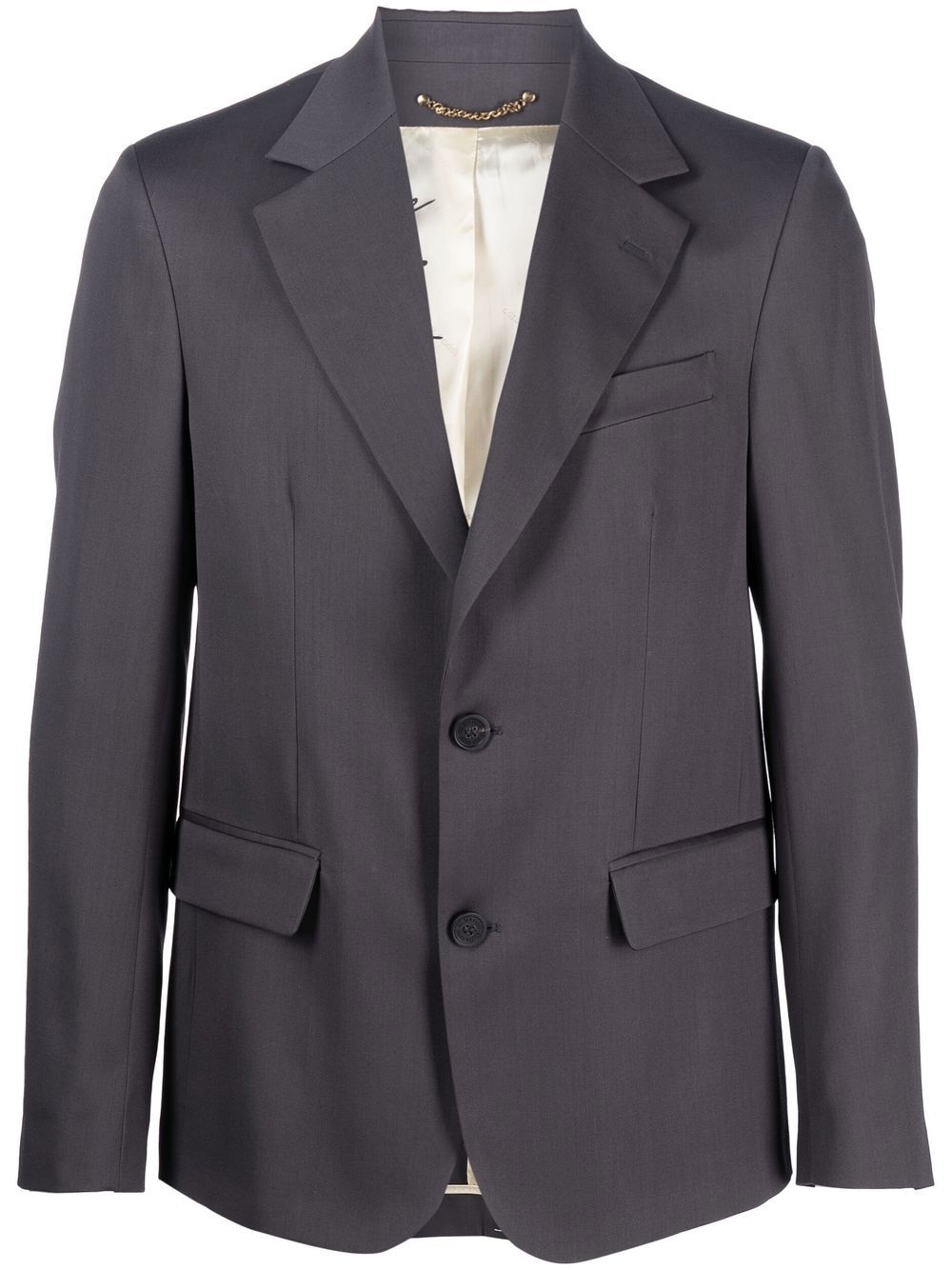 stud-detail single-breasted blazer charcoal grey virgin wool star stud detailing notched lapels front button fastening long sleeves buttoned cuffs central rear vent chest welt pocket two front flap pockets Made in Italy Composition Outer: Virgin Wool 100%, Wool 50%, Viscose 50% Lining: Polyester 55%, Viscose 45% SIZE & FIT Model measurements Height 6 ft 2 in(1.88 m) Bust/Chest 36.61 in(93 cm) Hips 37.79 in(96 cm) Waist 28.74 in(73 cm) FittingInformation This piece fits true to size. We recommend you get your regular size Cut for a slim fit Made with a mid-weight non-stretch fabric