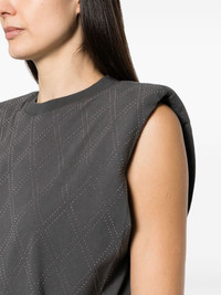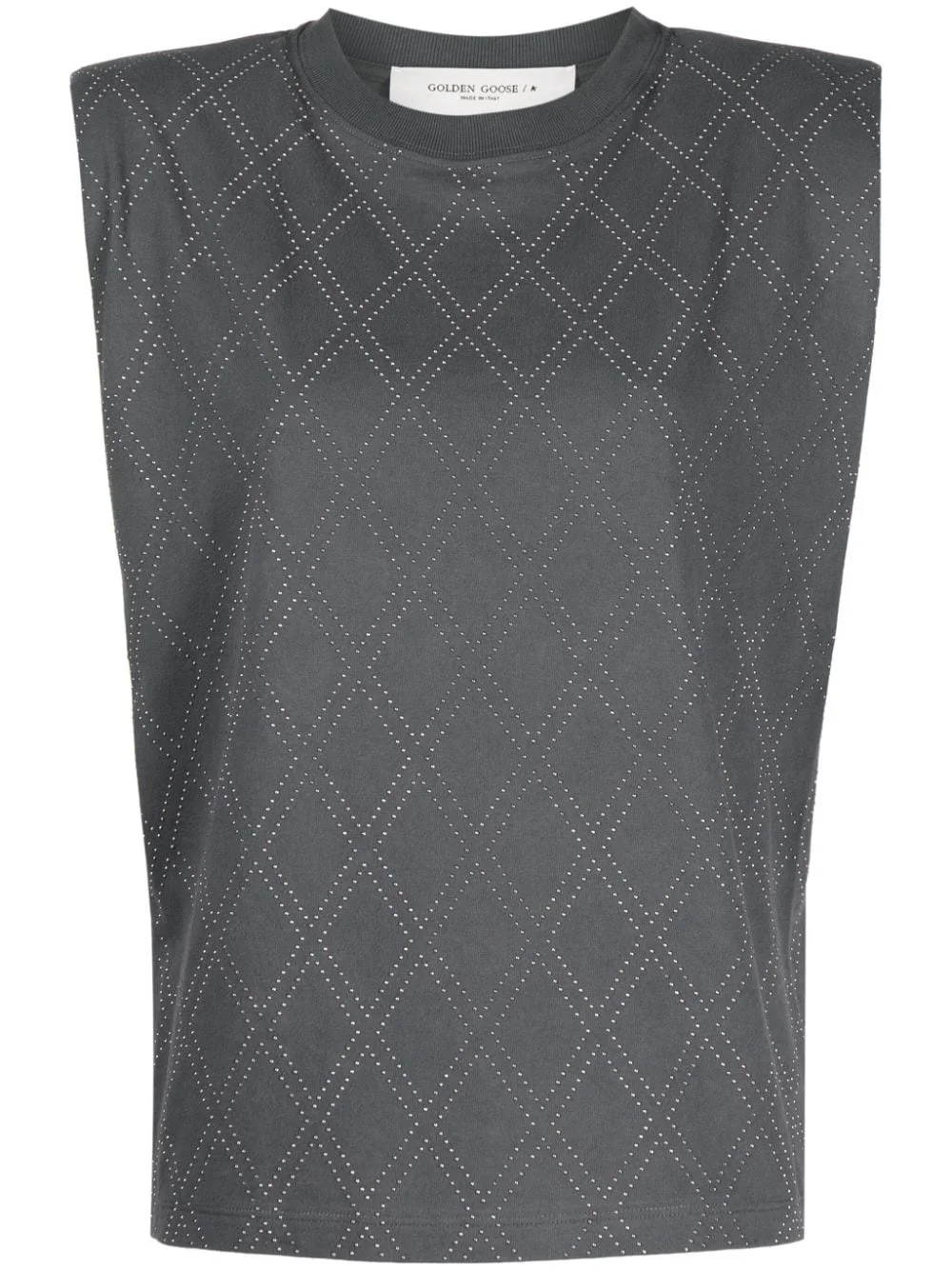 studded cotton T-shirt This grey Golden Goose T-shirt is part of the Journey Collection – an offering inspired by the City of Lights. It’s padded at the shoulders and embellished with petit studs precision placed into a diamond pattern. Highlights - Anthracite grey - Cotton - Jersey texture - Diamond pattern - Silver-tone stud detailing - Double star stud detail to the rear - Ribbed crew neck - Shoulder pads - Sleeveless - Straight hem Made in Italy Composition Cotton 100% SIZE & FIT Model measurements Height 5 ft 11 in(1.8 m) Bust/Chest 33.07 in(84 cm) Hips 37.4 in(95 cm) Waist 25.19 in(64 cm) FittingInformation Designed for a relaxed fit, this piece allows for comfort and movement when worn The internal shoulder pads offer a structured shape Made from a midweight non-stretch fabric, this piece offers minimal elasticity when worn This piece fits true to size – take your usual size Washing instructions Machine Wash