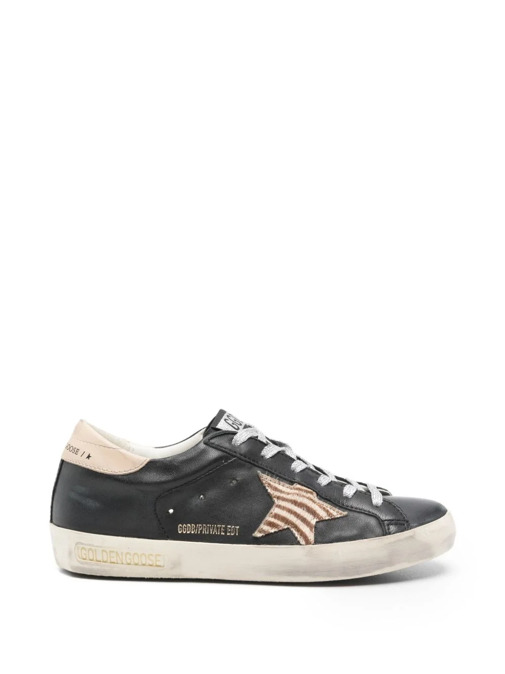 Super-Star in black nappa leather with zebra-print pony skin star and beige leather heel tab