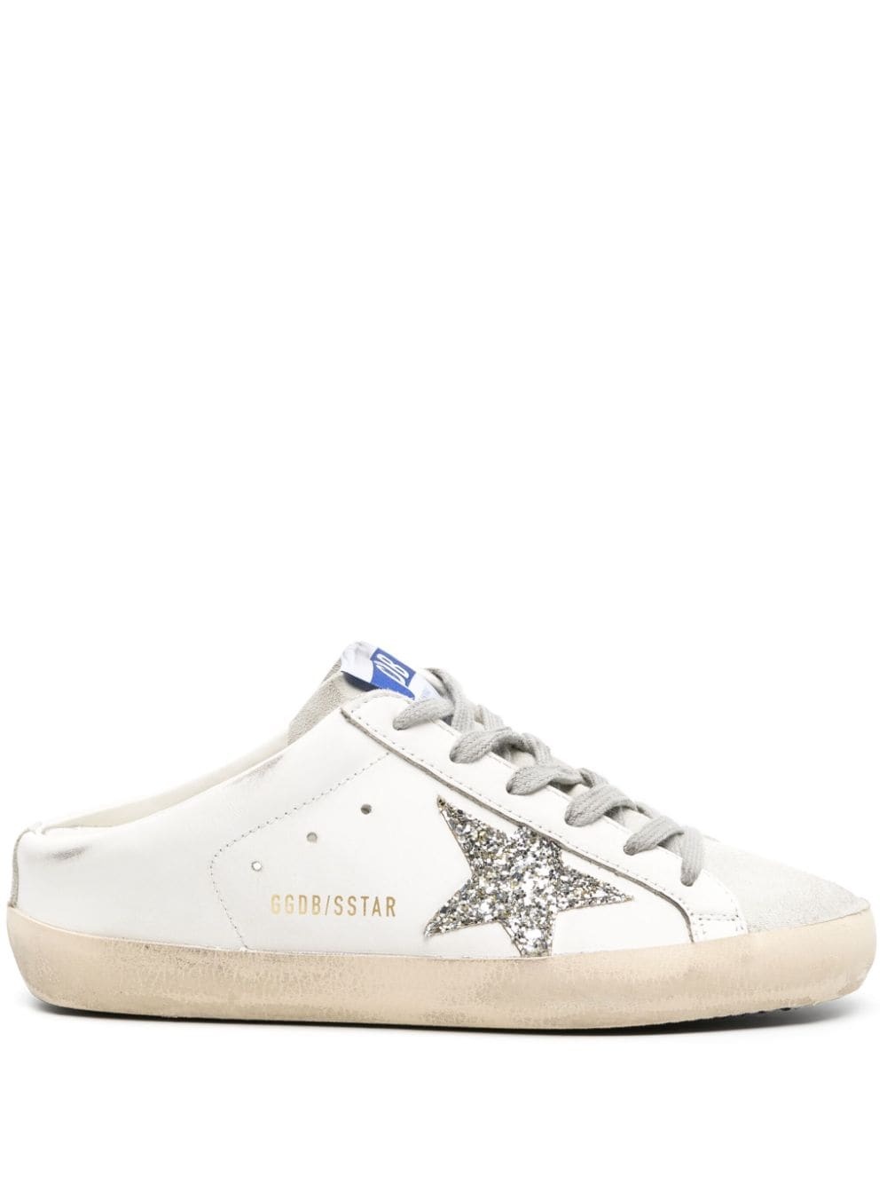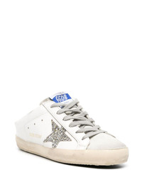Super-Star leather mules Crafted from leather, these mules offer a fresh interpretation of Golden Goose's iconic Super-Star sneakers. The lace-up silhouette is adorned with a glittering star patch on the side, while the open back ensures effortless wear. Highlights - White/silver-tone - Leather - Calf suede - Signature star patch to the sides - Glitter detailing - Logo patch at the tongue - Faux lace-up design - Round toe - Branded insole - Flat rubber sole Made in Italy Composition Leather 100% SIZE & FIT Measurement HEEL 1.77 in(4.5 cm) Sole height 0.78 in(2 cm)