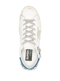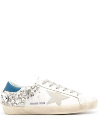 Super-Star leather sneakers Designed in 2007, the Super-Star were the first Golden Goose sneakers to boast the iconic star on the side. The recognisable pair meets the elegant flair of Swarovski crystals in this iteration. They're embellished with shimmering crystal stones on the back. Highlights - White - Calf leather - Smooth grain - Almond toe - Worn out effect - Logo-perforated tongue - Signature star patch to the sides - Logo print to the side - Gem embellishment - Contrasting heel counter - Branded leather insole - Rubber sole - Front lace-up fastening Made in Italy Composition Leather 100% SIZE & FIT Measurement HEEL 0.98 in(2.5 cm) Sole height 0.78 in(2 cm)