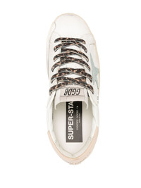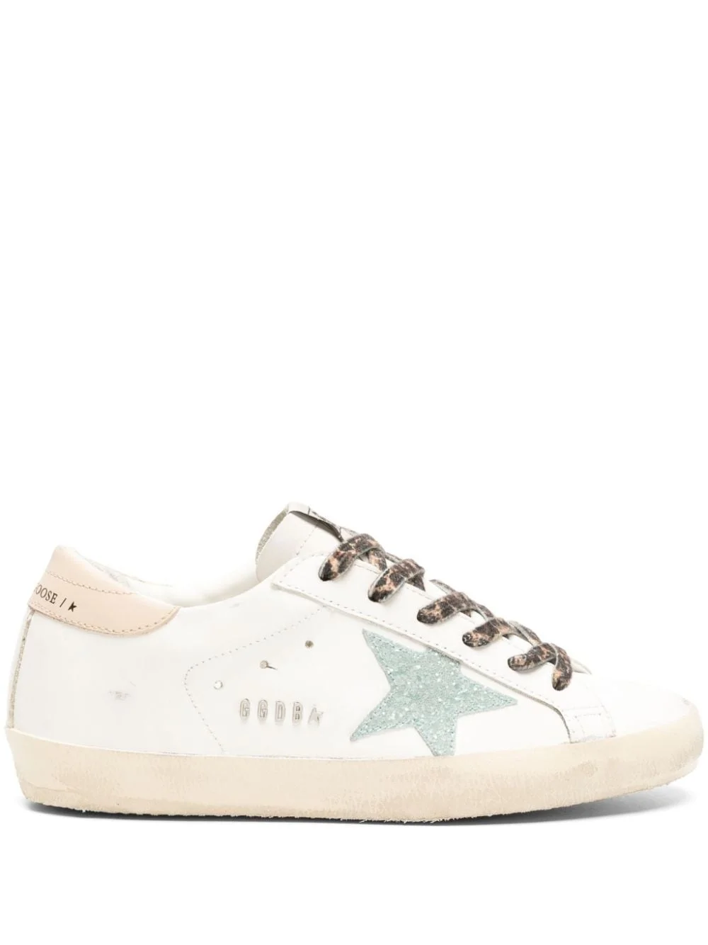 Super-Star leather sneakers A glittery star patch makes these sneakers distinctly Golden Goose. They're crafted from smooth calf leather with leopard-print laces and additional branding on the tongue, heel and sides. Highlights - Optical white - Calf leather - Distressed effect - Sequin star patch detail - Embroidered slogan to the rear - Silver-tone logo plaque - Logo patch at the tongue - Contrasting branded heel counter - Leopard print shoelaces - Front lace-up fastening - Round toe - Branded leather insole - Vulcanised-rubber sole - French terry lining Made in Italy Composition Leather 100% SIZE & FIT Measurement HEEL 0.98 in(2.5 cm) Sole height 0.78 in(2 cm)