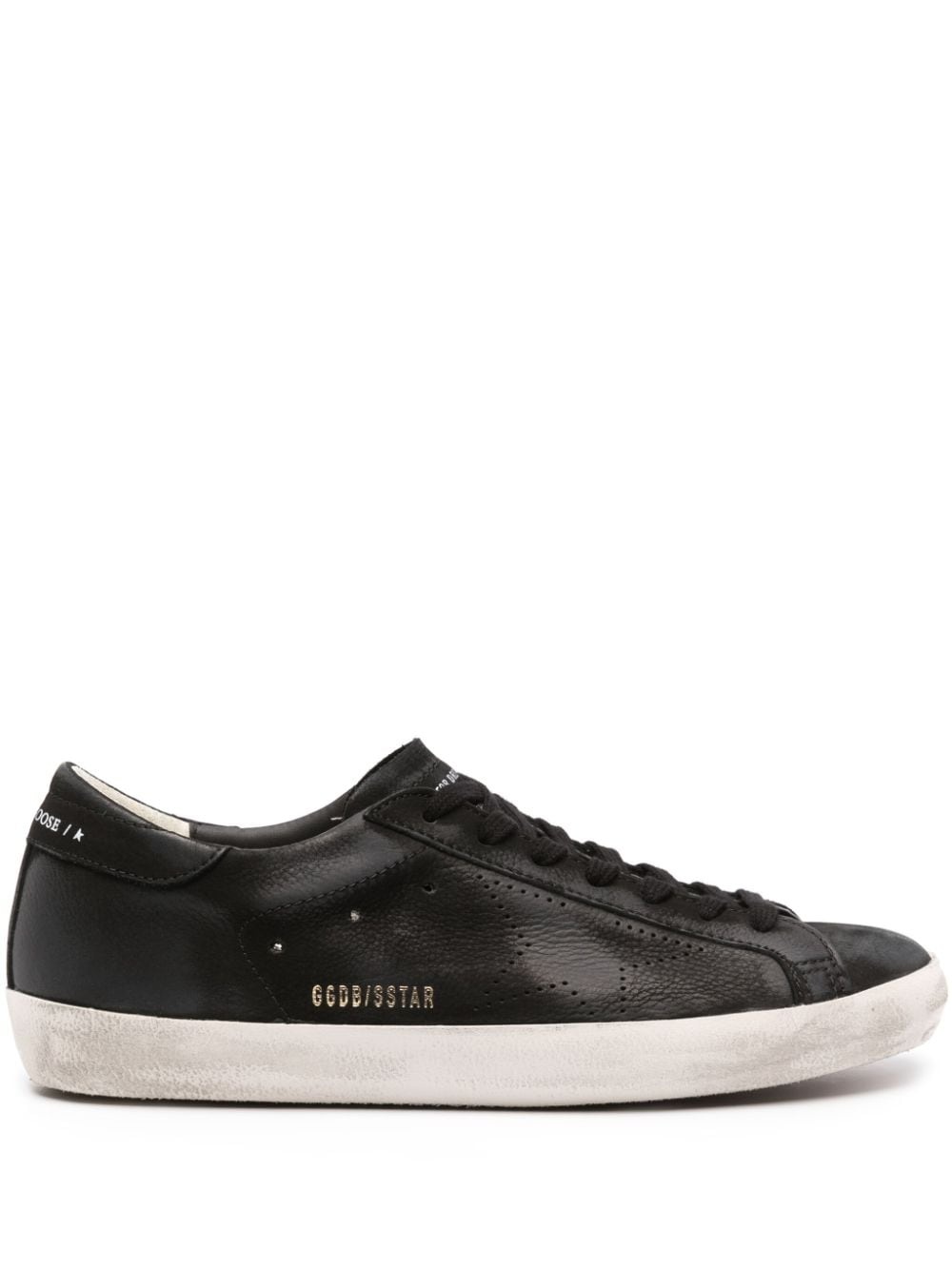 Super-Star leather sneakers An ethos of 'perfect imperfection' underpins Golden Goose’s sneaker lineup, as demonstrated with this Super-Star pair. They’re crafted in Italy from supple leather and hand-distressed for a love-worn finish. The brand’s signature star decorates the sidewalls. Highlights - Black - Calf leather - Perforated logo detail - Round toe - Front lace-up fastening - Logo-print tongue - Logo print to the rear - Branded insole - Rubber sole Made in Italy Composition Lining: Calf Leather 100%, Fabric 100% Outer: Calf Leather 100% Sole: Rubber 100% SIZE & FIT Measurement HEEL 1.18 in(3 cm) Sole height 0.98 in(2.5 cm) Washing instructions Read Manufacturer Guidelines