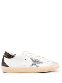 Super-Star sneakers Golden Goose's most iconic silhouette is reinvented with new colourways and detailing every season. Crafted in a panelled design, this SS23 pair is adorned with whimsical glitter accents. Highlights - White/multicolour - Calf leather - Signature star patch to the sides - Glitter detailing - Contrasting branded heel counter - Logo print to the side - Front lace-up fastening - Round toe - Flat rubber sole Made in Italy Composition Sole: Rubber 100% Outer: Leather 85%, Polyethylene Terephthalate (PET) 11%, Cotton 4% Lining: Leather 49%, Cotton 41%, Polyamide 5%, Polyurethane 5% SIZE & FIT Measurement HEEL 1.57 in(4 cm) Sole height 0.98 in(2.5 cm)