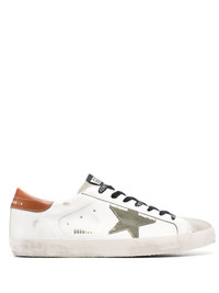 Super-Star low-top sneakers Golden Goose's most recognisable silhouette, the Super Star sneakers are reimagined for SS23 in a white, ice and olive green iteration that's crafted from smooth calf leather in Italy. Designed for a signature distressed look, they're adorned with a star patch at the side. Made in Italy Composition Outer: Calf Leather (top grain) 100% Lining: Calf Leather (top grain) 100% Sole: Rubber 100% SIZE & FIT Measurement HEEL 1.18 in(3 cm) Sole height 0.98 in(2.5 cm)