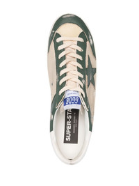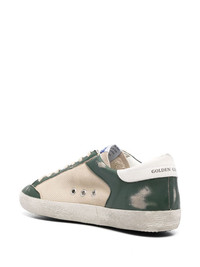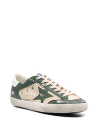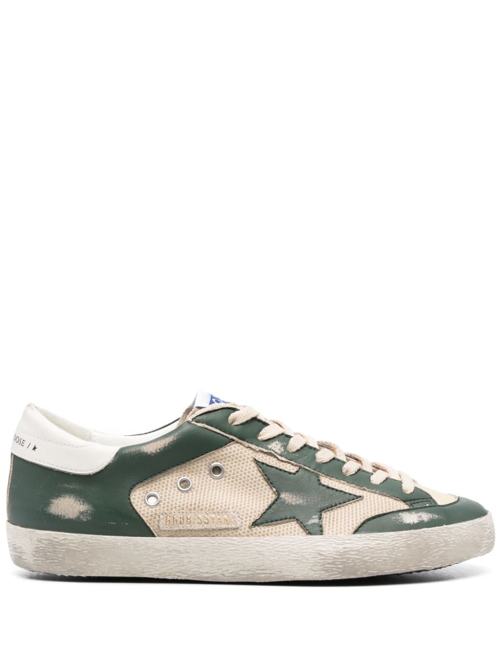 Super-Star mesh panelled sneakers Golden Goose's most iconic silhouette is reinvented with new colourways and detailing every season. Crafted with an off-white and green panelled design with the brand's signature distressed finish and star patch. Highlights - Off-white/forest green - Calf leather/cotton - Distressed finish - Mesh detailing - Panelled design - Signature star patch to the sides - Front lace-up fastening - Round toe - Flat rubber sole Made in Italy Composition Lining: Cotton 100% Outer: Polyester 100%, Calf Leather 100% Sole: Rubber 100% SIZE & FIT Measurement HEEL 0.98 in(2.5 cm) Sole height 0.78 in(2 cm)