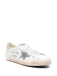 Super Star metallic-trim sneakers Golden Goose’s Super-Star sneakers are iconic for being the first to feature the brand’s ubiquitous celestial patches. This distressed white pair features a grey-blue version of the applique and gold snake-effect heel counters. Highlights - White/blue-grey/gold-tone - Calf leather - Suede panel - Snakeskin-effect panel - Signature star patch to the sides - Distressed effect - Logo plaque - Logo patch at the tongue - Front lace-up fastening - Round toe - Contrasting branded heel counter - Branded leather insole - Flat rubber sole - This piece comes with a certificate of authenticity. - This piece comes complete with a protective dust bag. Made in Italy Composition Lining: Calf Leather 100%, Rubber 100%, Fabric 100% Sole: Rubber 100% Outer: Calf Leather 100% SIZE & FIT Measurement HEEL 1.18 in(3 cm) Sole height 0.98 in(2.5 cm) Washing instructions Read Manufacturer Guidelines