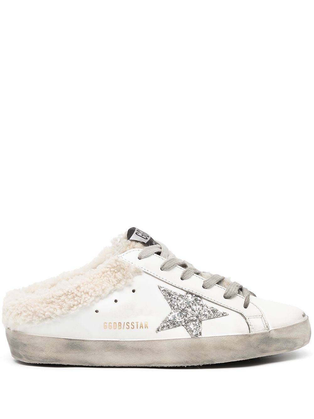 Super-Star Sabot shearling-lined sneakers off-white leather front lace-up fastening signature star patch to the sides shearling lining flat rubber sole Made in Italy Composition Outer: Calf Leather 95%, Polyester 4%, Polyethylene Terephthalate (PET) 1% Lining: Sheep Skin/Shearling 76%, Calf Leather 24% Sole: Rubber 100% SIZE & FIT Measurement HEEL 0.78 in(2 cm)