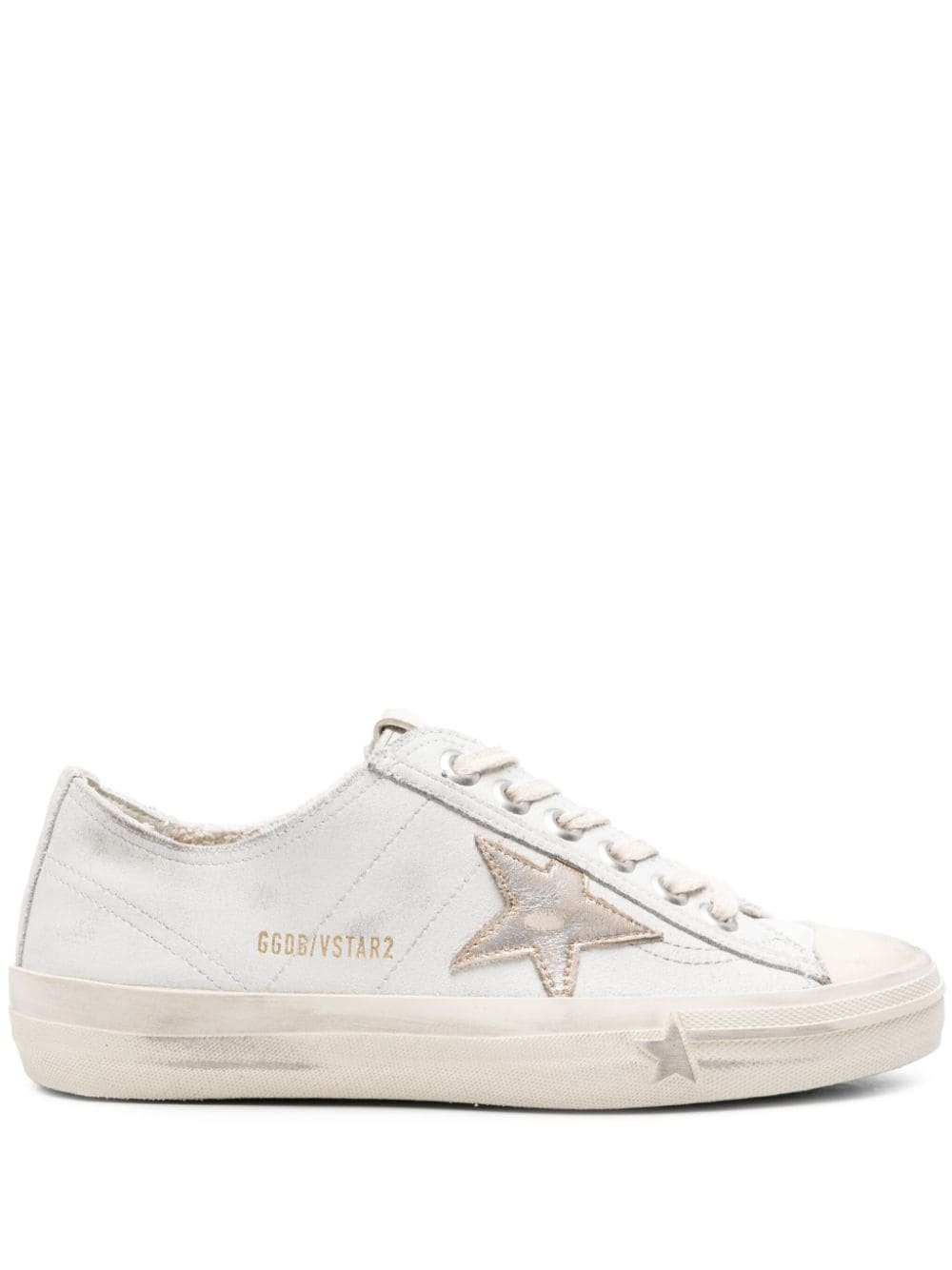 V-Star 2 leather sneakers Golden Goose demonstrates that ‘beauty lies in simplicity’ with these V-Star 2 sneakers. They’re crafted from hand-distressed white leather to a low-top silhouette and adorned with a signature star motif at the sidewall. Highlights - Light blue/gold-tone - Calf leather - Distressed effect - Round toe - Rubber toecap - Front lace-up fastening - Logo patch at the tongue - Signature star patch to the sides - Flatform sole - Logo at the sole - Branded insole Made in Italy Composition Leather 100% SIZE & FIT Measurement HEEL 1.18 in(3 cm) Sole height 0.59 in(1.5 cm)