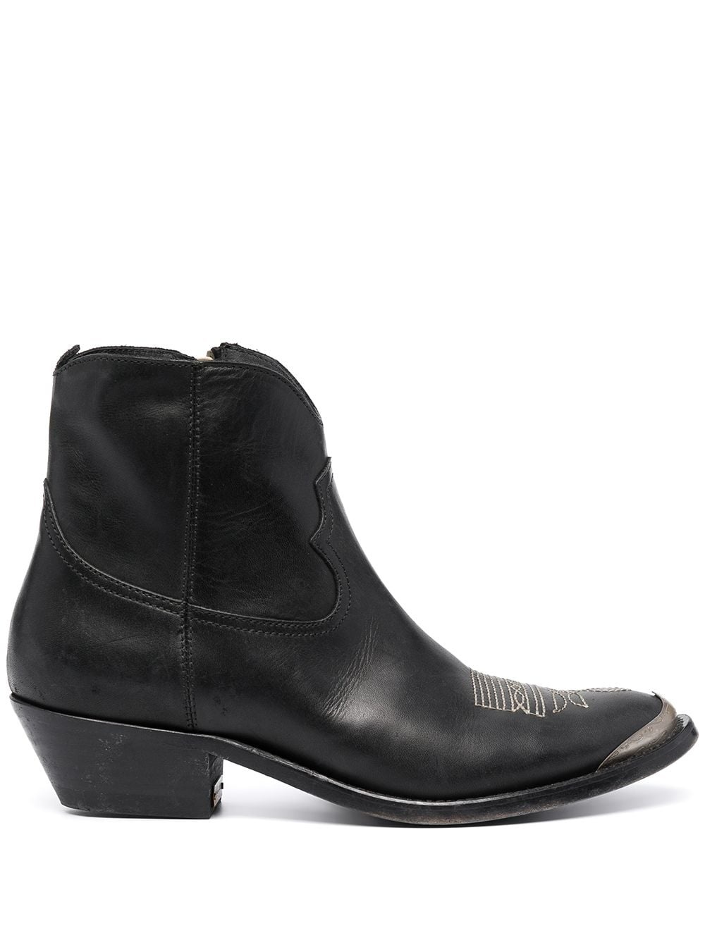 Young cowboy boots If you're looking for a Western-inspired boot that isn't as bold as a cowboy boot, you're in the right place. These Young ankle boots from Golden Goose strike the right balance and sit atop a modest heel, so they're perfect for everyday wear. These boots are made for walking. Highlights - Black - Leather - Embroidered design - Metal toecap - Almond toe - Ankle-length - Side zip fastening - 45mm cuban heel - Leather sole Made in Italy Composition Outer: Leather 100% Lining: Leather 100% Sole: Leather 100% SIZE & FIT Measurement CIRCUMFERENCE 8.66 in(22 cm) HEEL 1.77 in(4.5 cm) HEIGHT 5.11 in(13 cm) Sole height 0.39 in(1 cm)