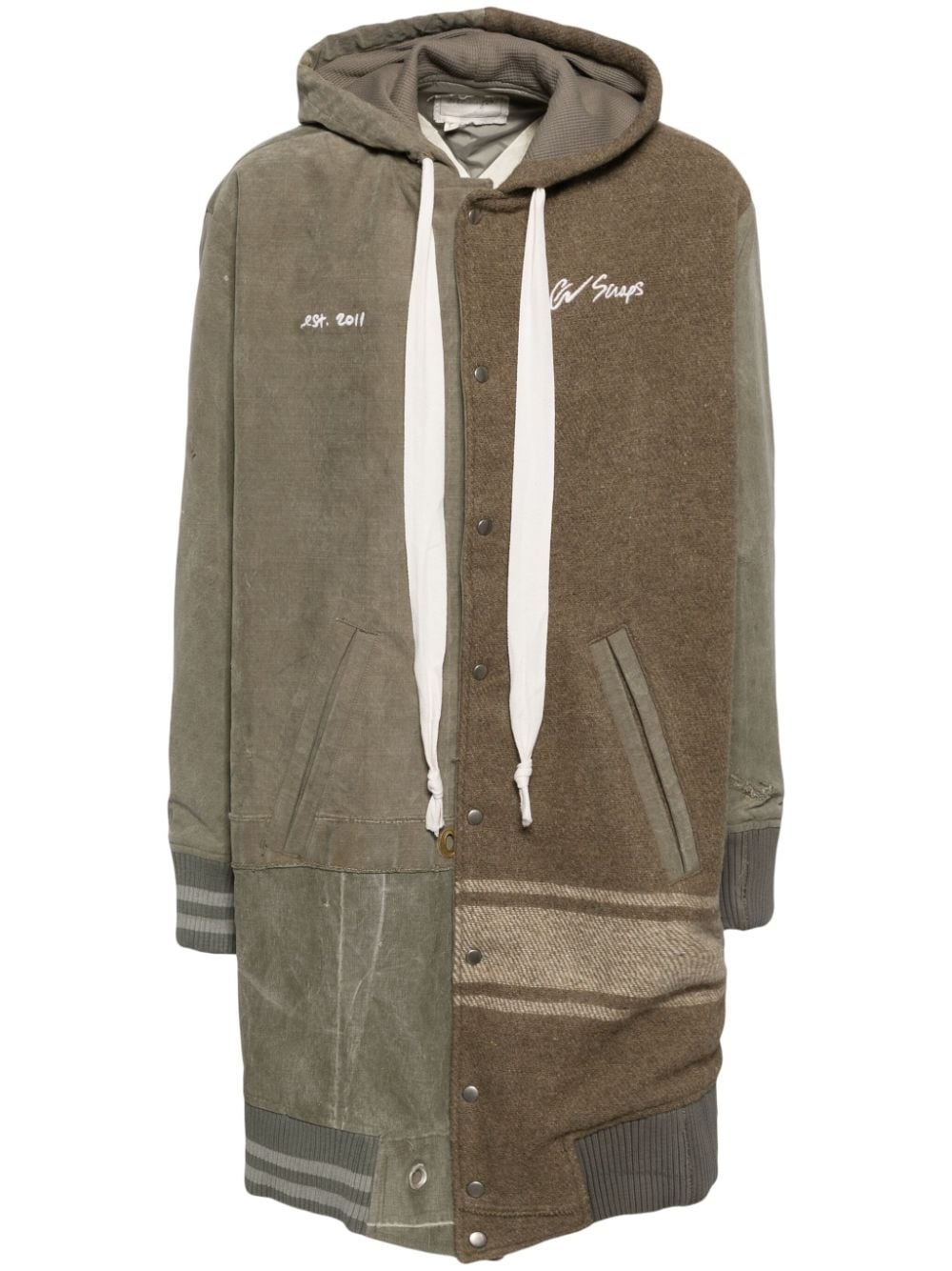 logo-embroidered patchwork jacket Highlights - Olive brown - Cotton blend - Drawstring hood - Concealed front press-stud fastening - Patchwork design - Embroidered logo to the front - Two front welt pockets - Ribbed cuffs and hem - Full lining Made in United States Composition Outer: Cotton 55%, Wool 45% Lining: Nylon 100%