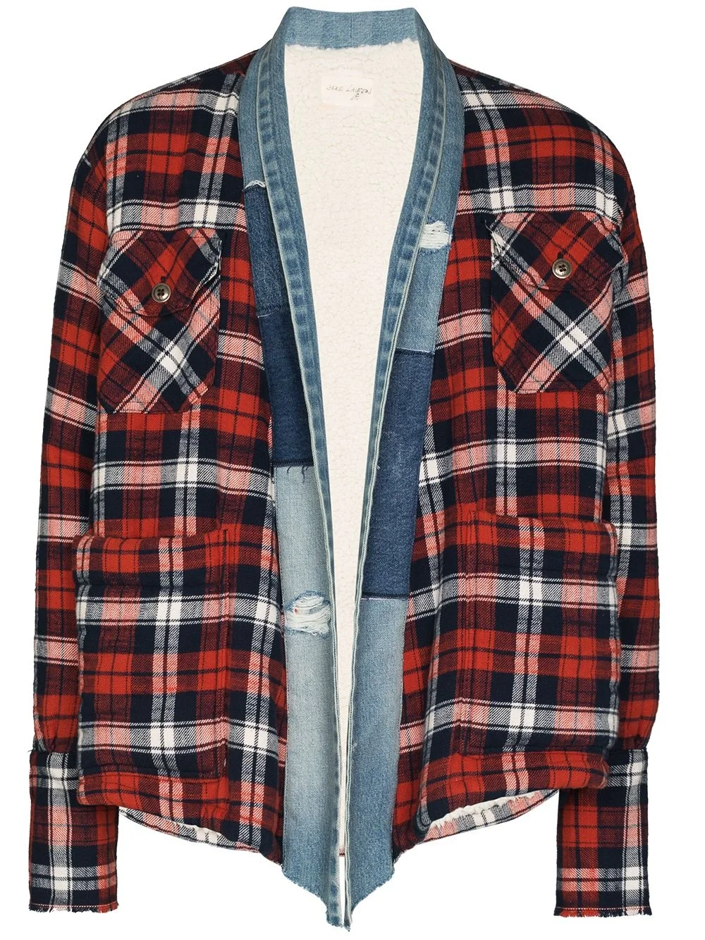 plaid flannel and denim cardigan Greg Lauren's cardigan is crafted from cotton in the United States. With a distressed finish, this piece boasts a plaid check pattern and a denim trim that showcase the designer's penchant for unorthodox combinations. Made in United States Composition Lining: Polyester 100% Outer: Cotton 100% SIZE & FIT Model measurements Height 6 ft 2 in(1.87 m) Bust/Chest 36.41 in(92.5 cm) Hips 37 in(94 cm) Waist 29.52 in(75 cm) Measurement BUST 42.51 in(108 cm) FittingInformation This piece fits true to size. We recommend you get your regular size Cut for a loose fit Made with a mid-weight non-stretch fabric Washing instructions Dry Clean Only
