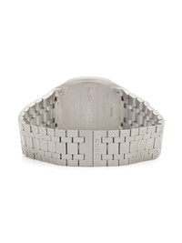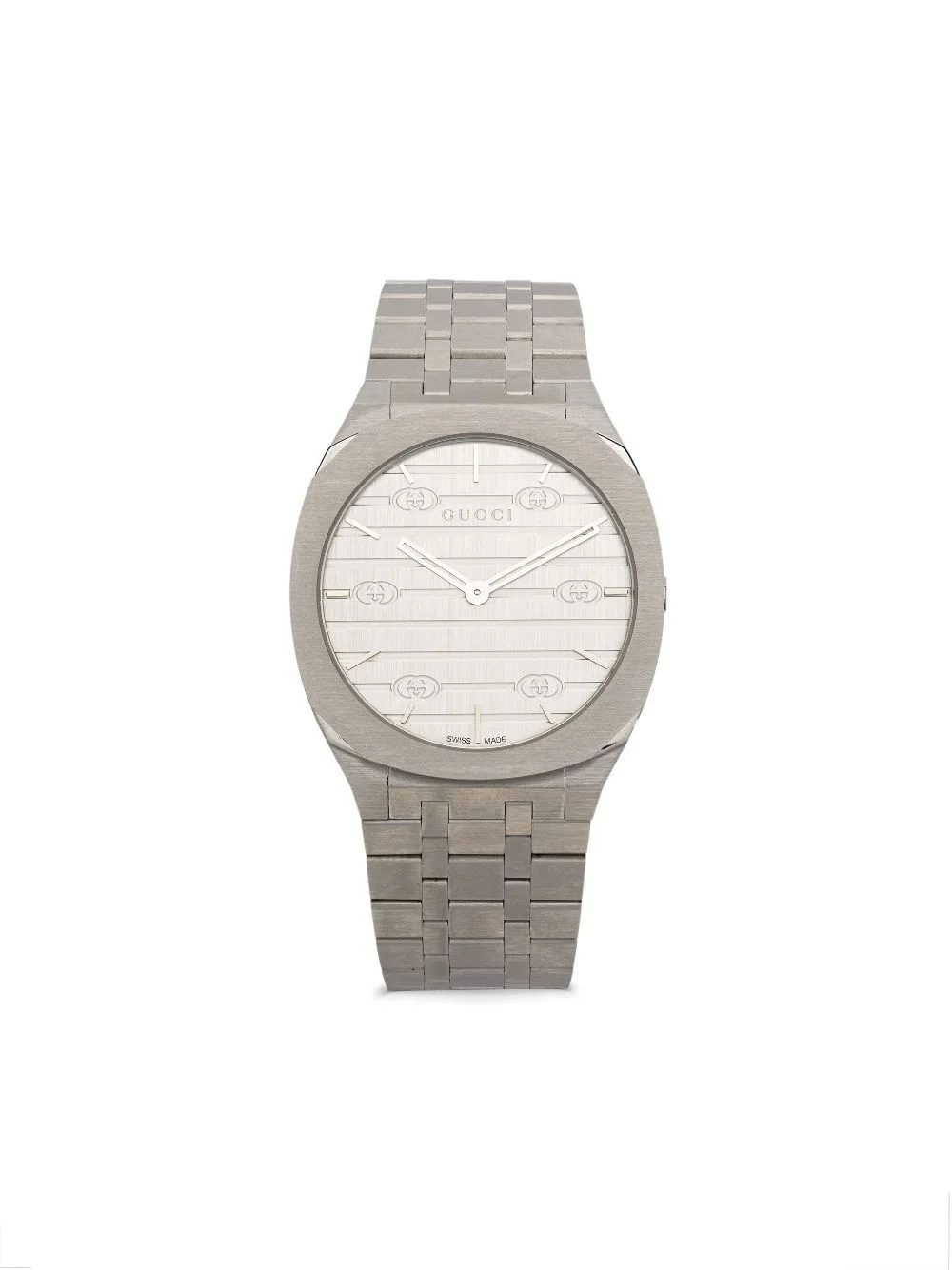 25H 34mm Gucci is known for adding a House touch to each design. A fine example is this 25H ultra-thin 34mm that seamlessly combines both a sleek stainless steel profile with the elegant interlocking G motif as a nod to its signature codes. Highlights - Silver - Round face - Quartz movement - Adjustable link bracelet - Clasp fastening - Index hands - Screw-down crown - This item comes with a standard two-year warranty from the brand. Imported SIZE & FIT Model measurements Height 5 ft 10 in(1.78 m) Bust/Chest 33.07 in(84 cm) Hips 36.61 in(93 cm) Waist 24.8 in(63 cm) Measurement DIAMETER 1.33 in(3.4 cm) CIRCUMFERENCE 7.24 in(18.4 cm) Thickness 0.15 in(0.4 cm) WIDTH 0.78 in(2 cm)
