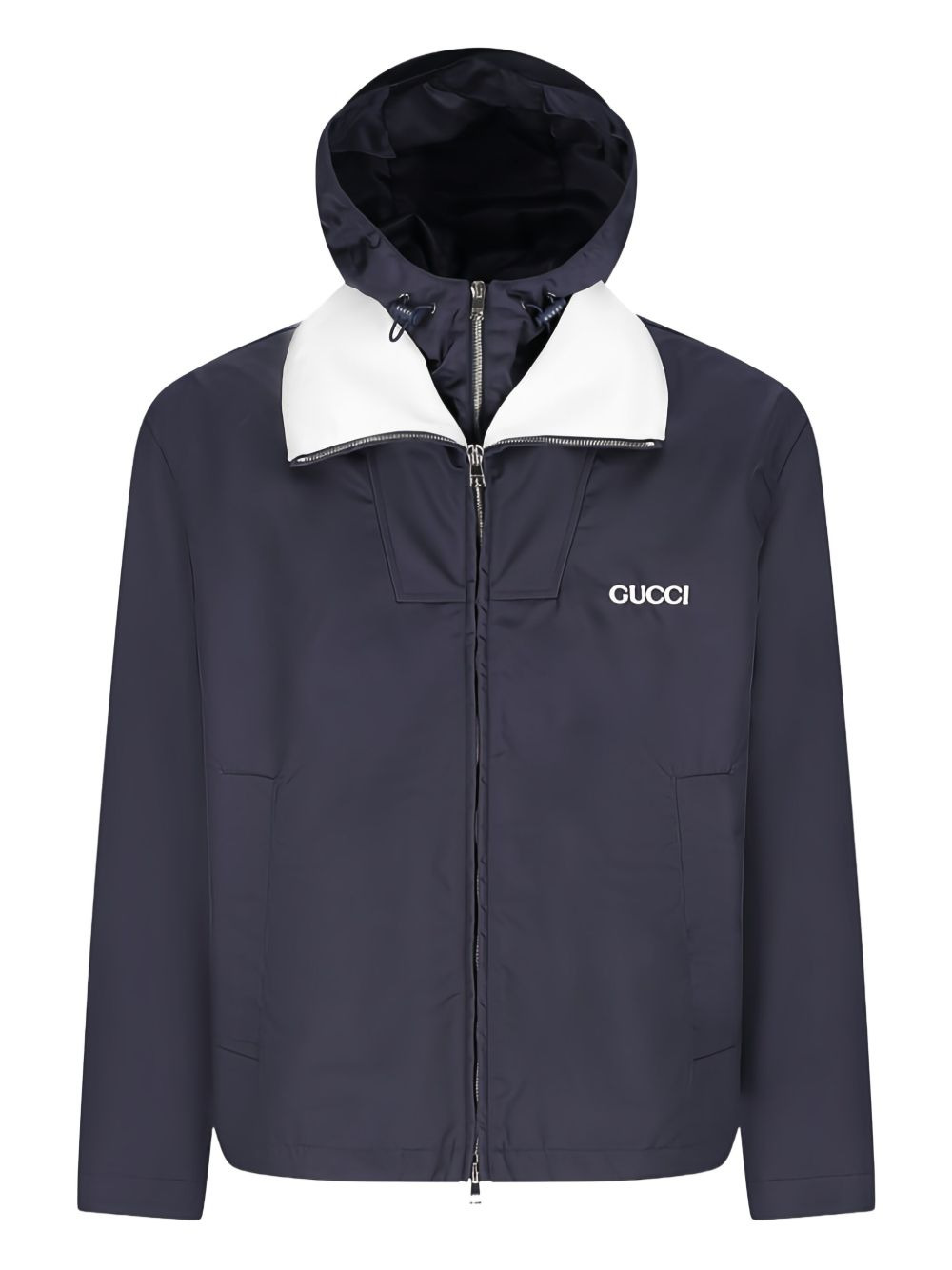attached hood logo-detail jacket Highlights - Dark blue - Hooded neckline - Zip fastening - Logo detail - Welt pockets Imported Composition Nylon 100% Washing instructions Read Manufacturer Guidelines